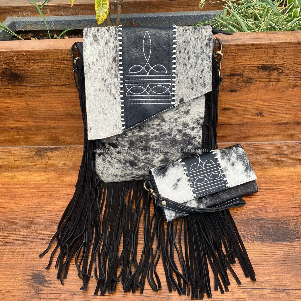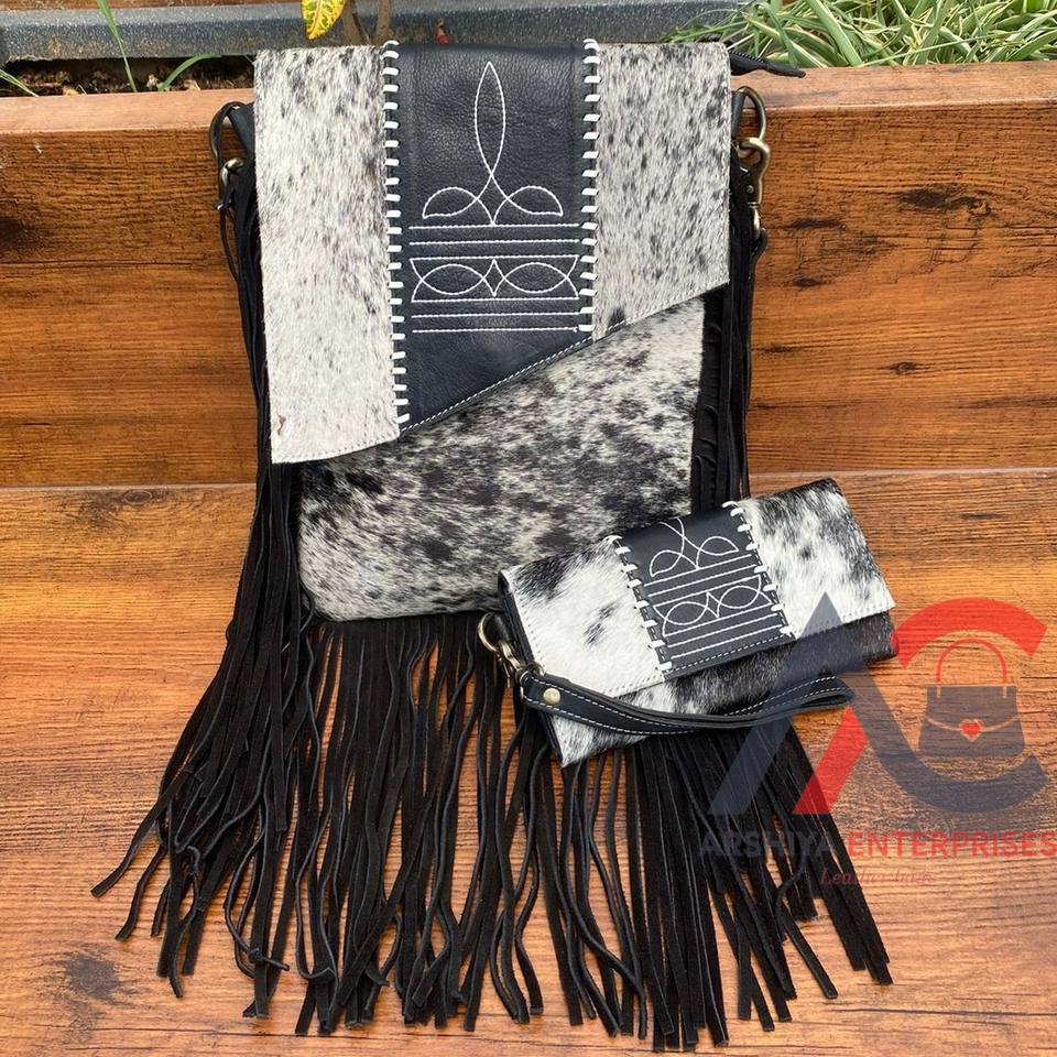 Western Hair on Genuine Leather Boot Stitch Fringe Crossbody Bag & Boot Stitch Genuine Cow Leather Wristlet Wallet Combo Sets