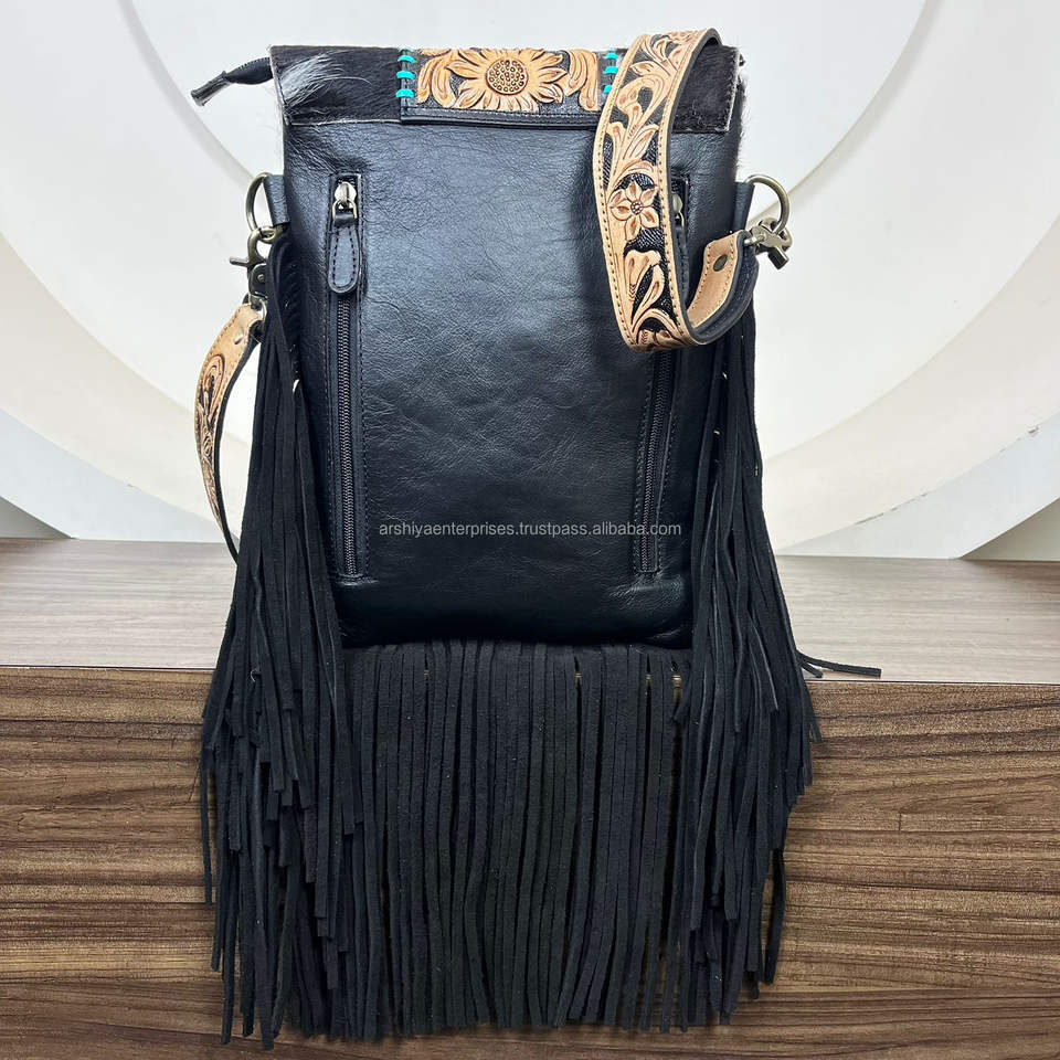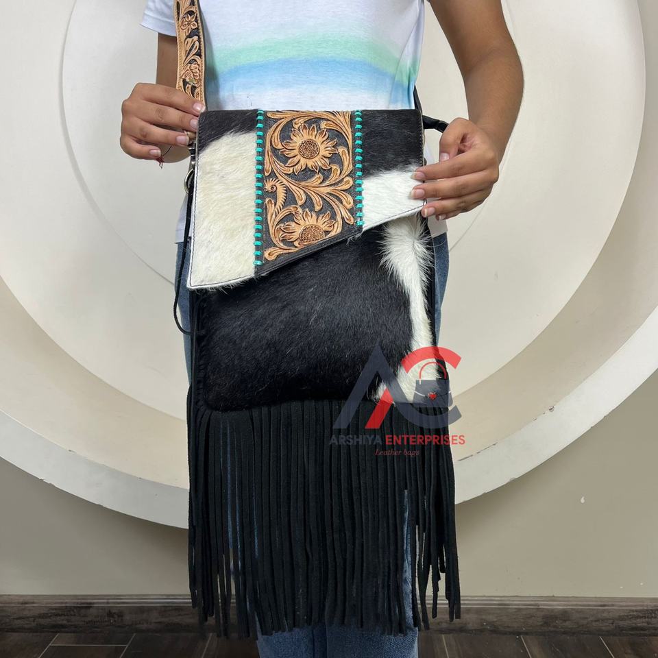 New Western Hand Tooled Leather Fringe Crossbody Bag for Women Genuine Hair On Cowhide Leather Concealed Carry Shoulder Handbag