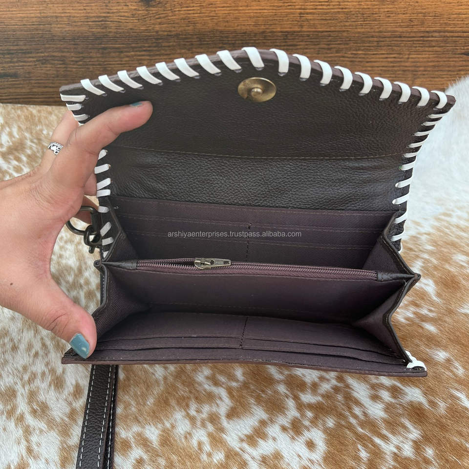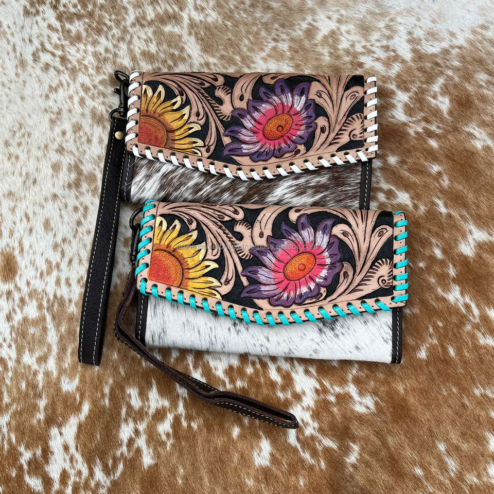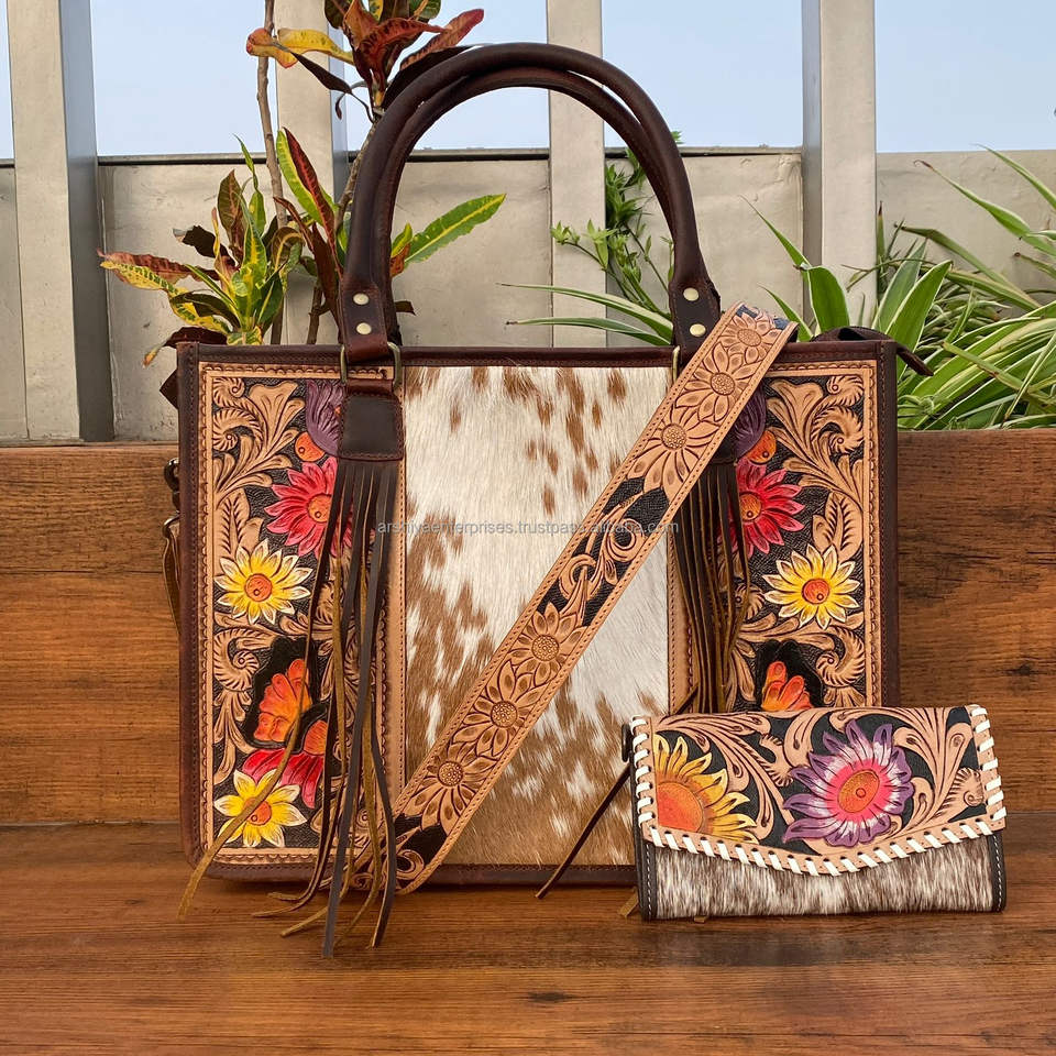 Western Hair on Tooled Leather Floral Concealed Carry Tote Bag and Hand Tooled Cowhide Floral Wristlet Wallet Sets for Women's