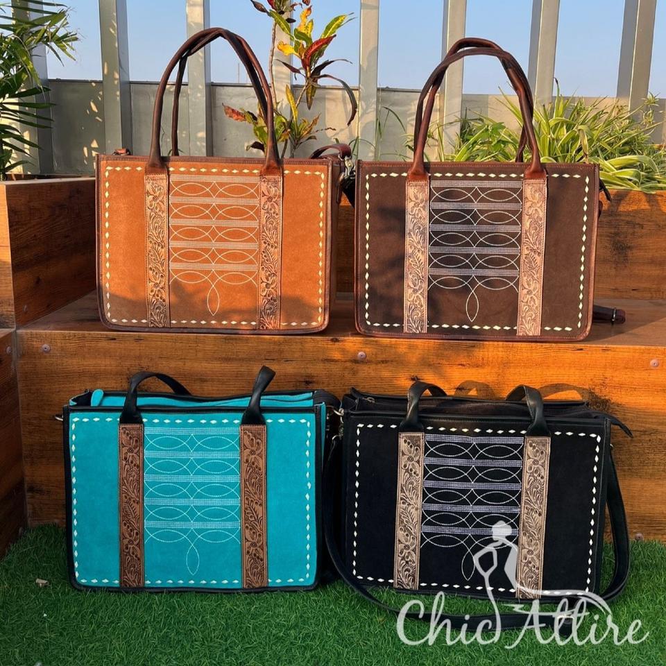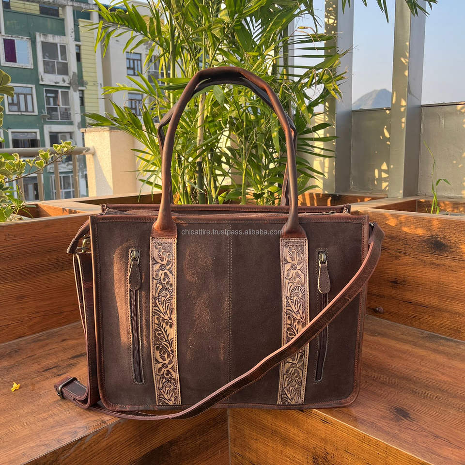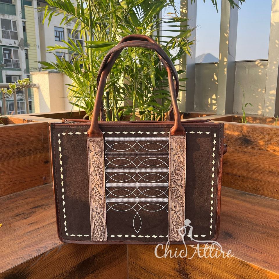 Western Hand Tooled Brown Suede Leather Boot Stitch Tote Bag Concealed Carry Laptop Bag Premium Genuine Leather Purse for Womens