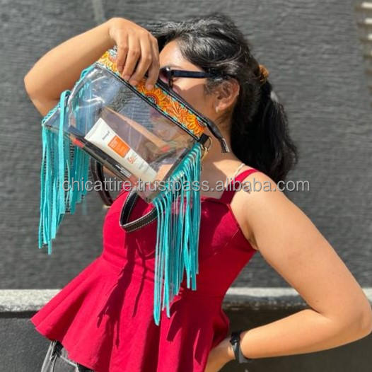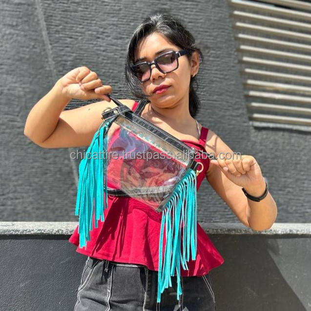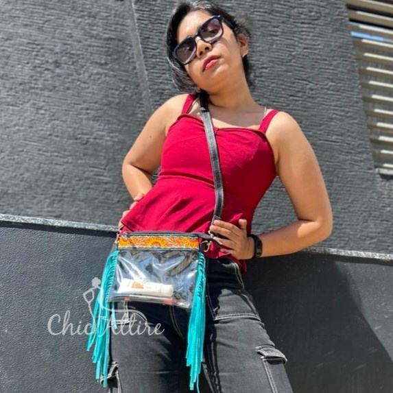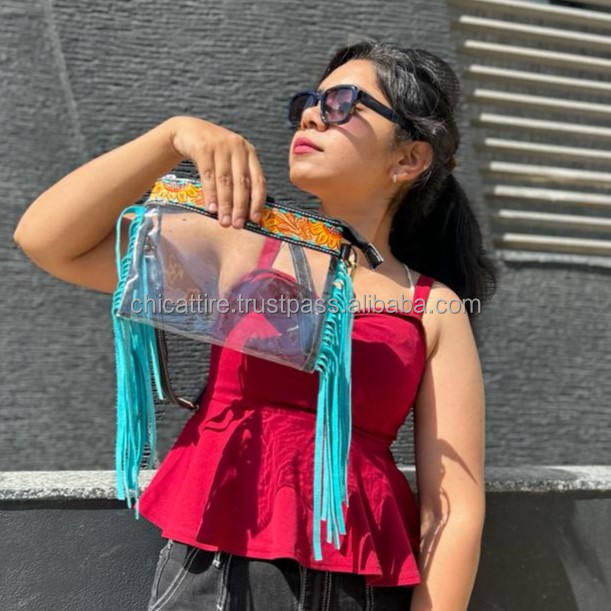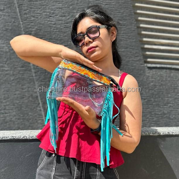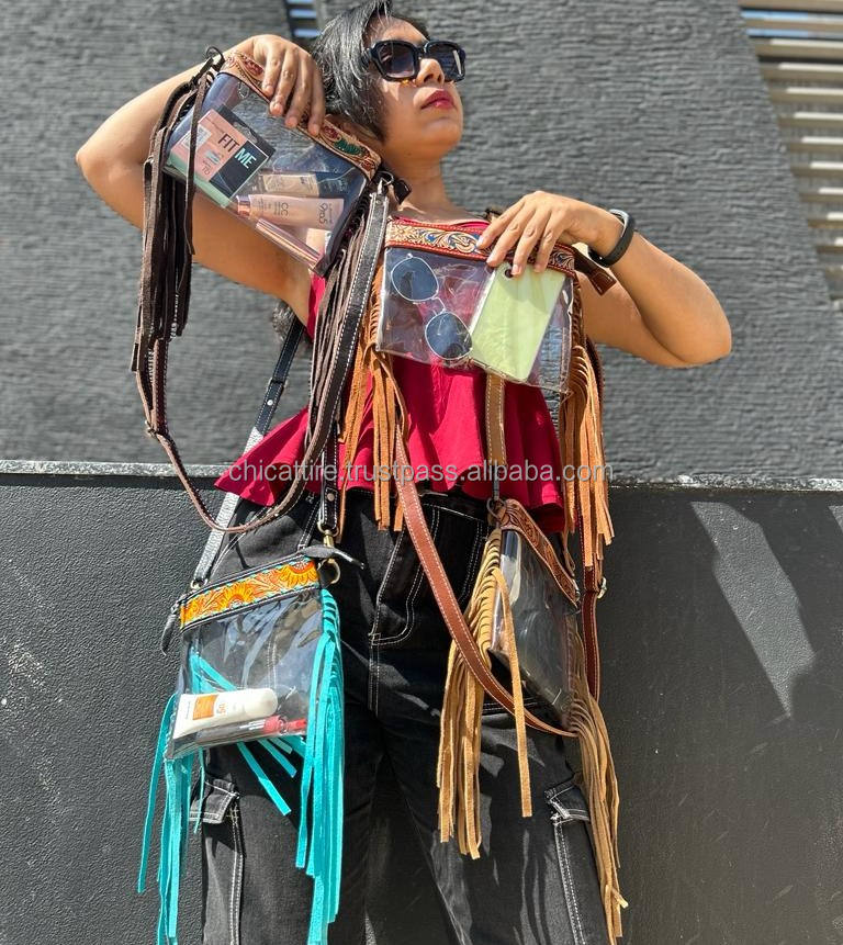 Product name:Tooled Leather Fringe Clear Stadium Bag