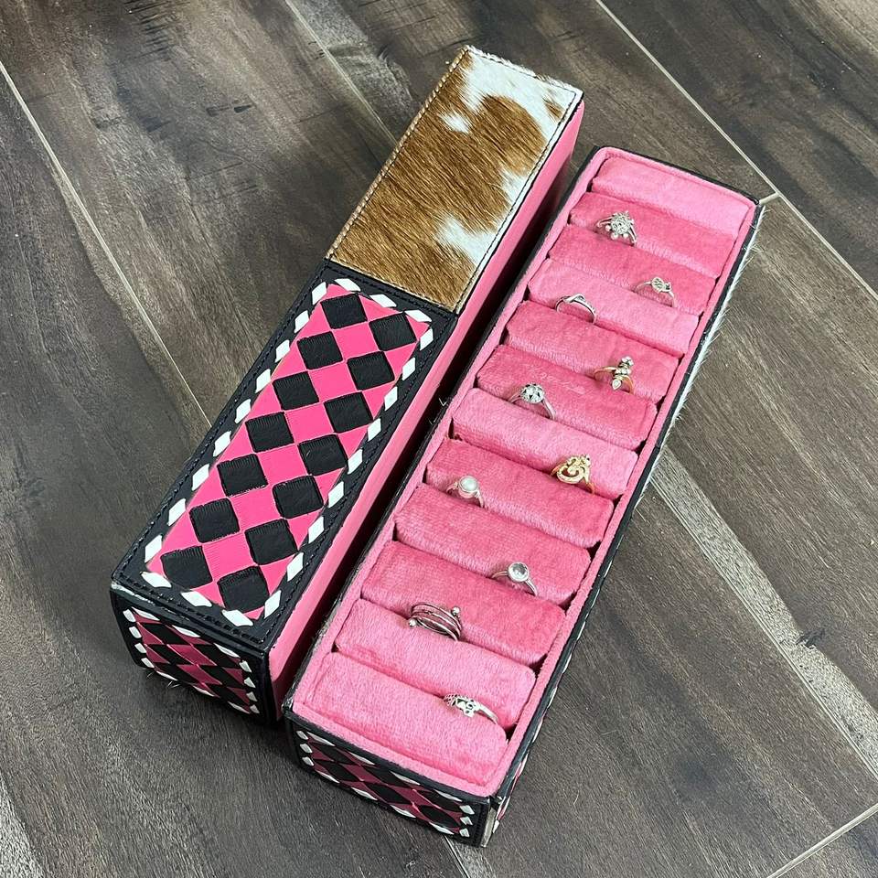 Western Hand Tooled Cow Leather Ring Box Display Pink Velvet Multi-Slot Organizer Stand Checkerboard Jewelry Holder for Boutique