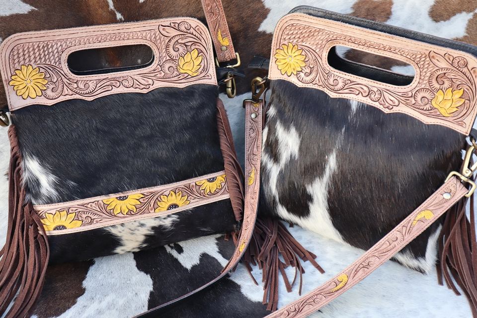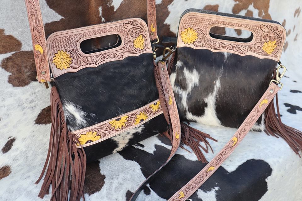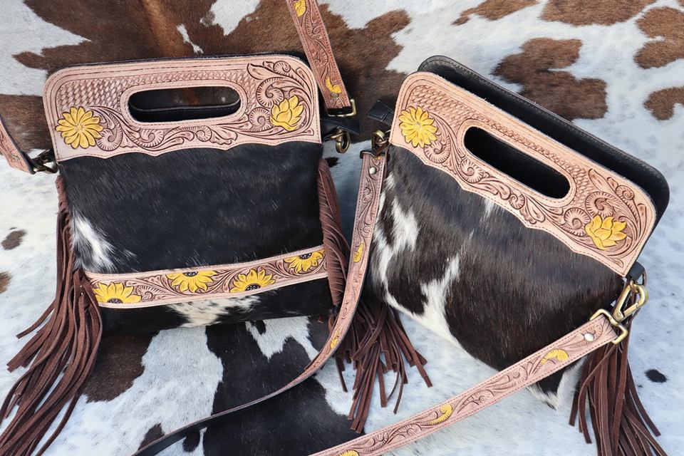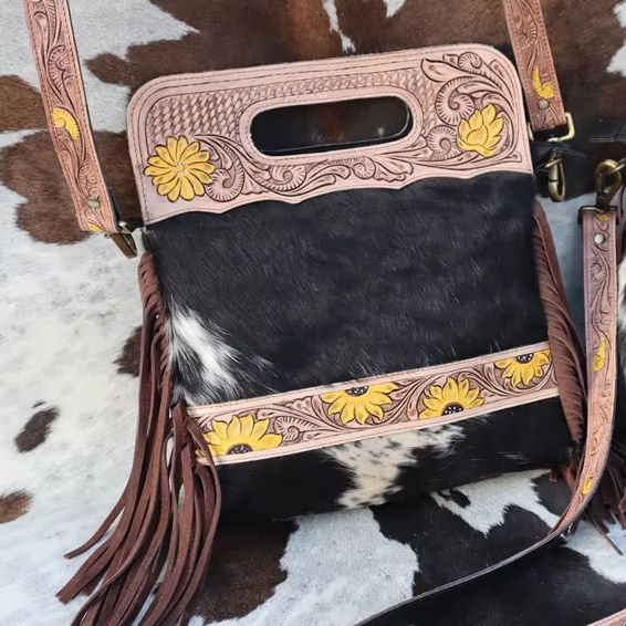 Western Hand Tooled Fringe Handbags Sling Bags Bohemian Cowhide Hair on New Design Vintage Stylish Bags for Women's