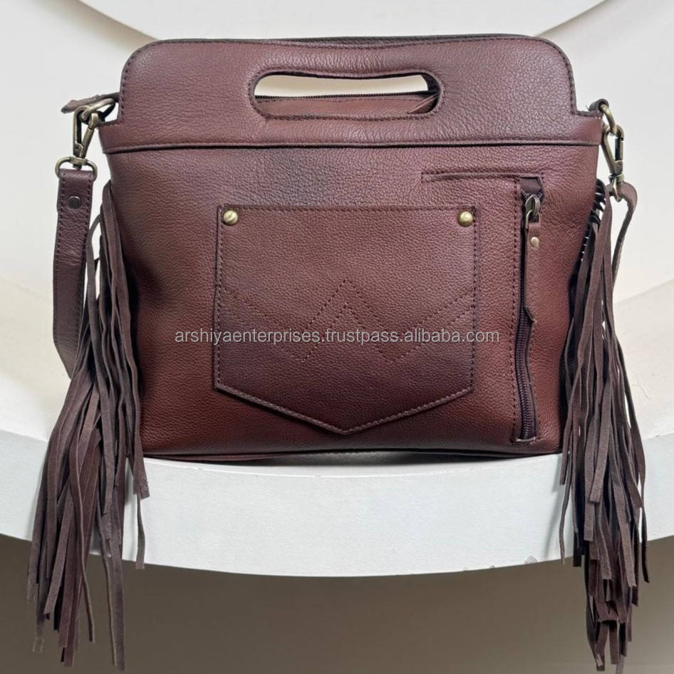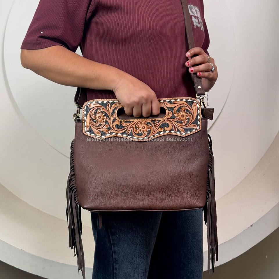 Manufacturer Wholesale Prices Hand Tooled Genuine Leather Fringe Crossbody Shoulder Bag for Women's Cowhide Top Handle Handbags