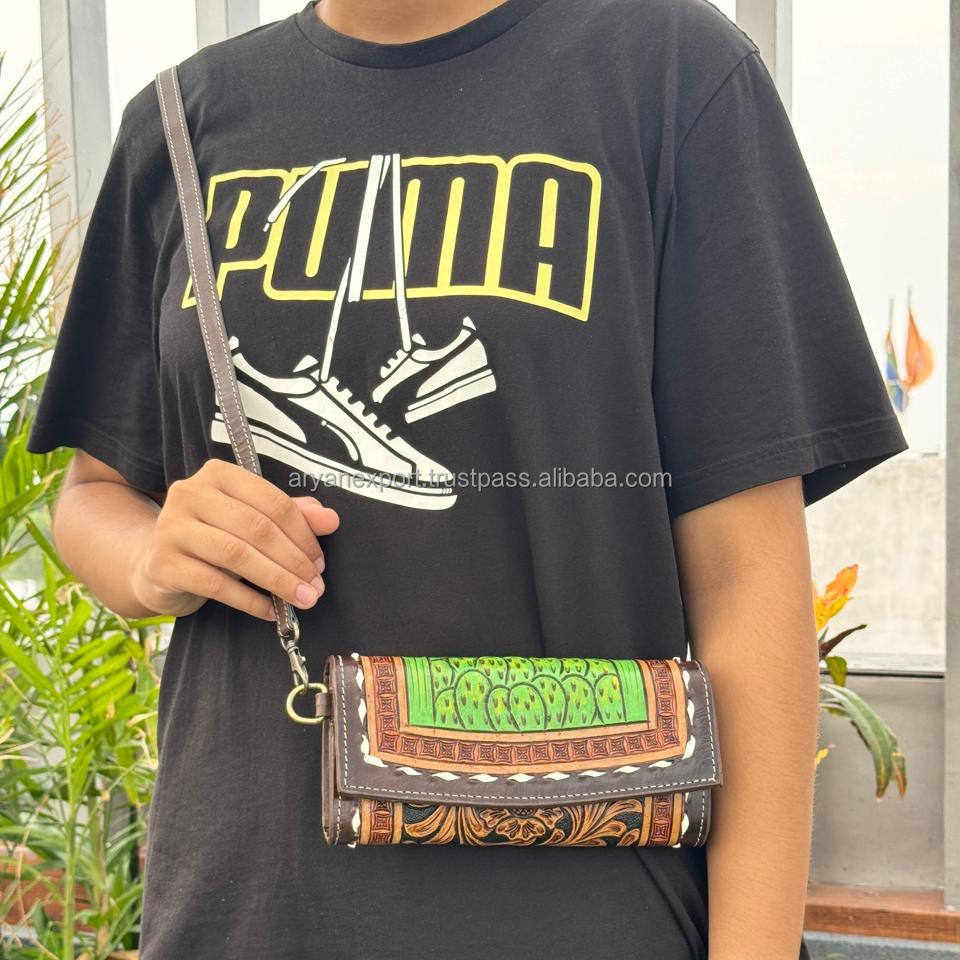 New Western Hand Tooled Leather Cactus Tooled Purse Genuine Leather Crossbody Wallet Wholesale Cowhide Women Purse Floral Wallet