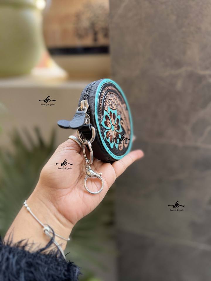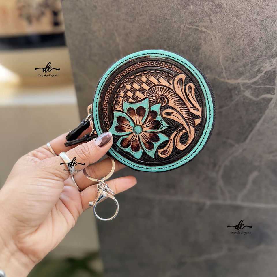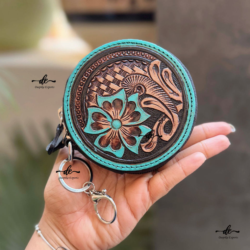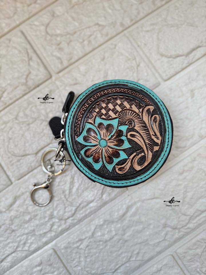 Western Hand Tooled Leather Coin Purse Stylish Clutch Wallet Purse Turquoise Color Western Style Unisex Clutch Coin Purse