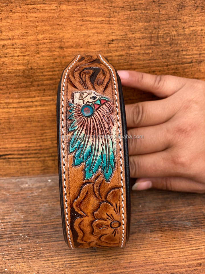 Western Hand Tooled Leather Dog Collar Skull Hand Tooled Pet Collars Wholesale Cowhide Leather Multi-Purpose Padded Dog Collar