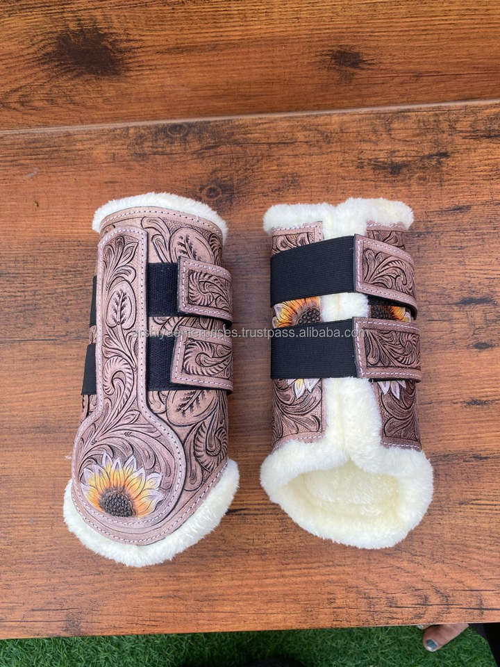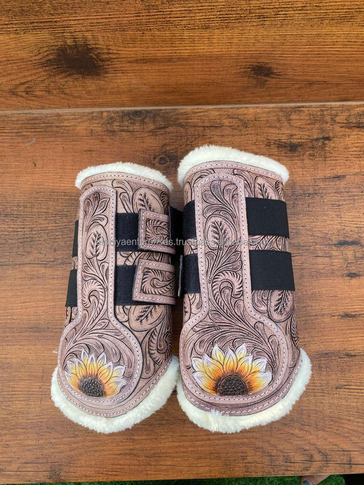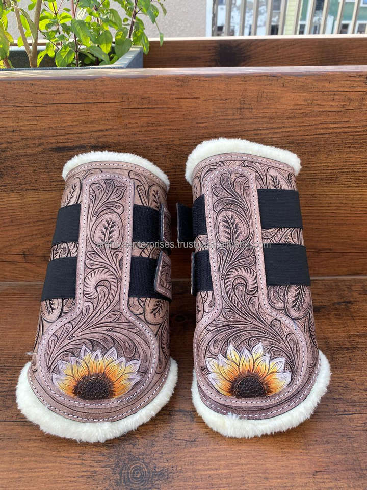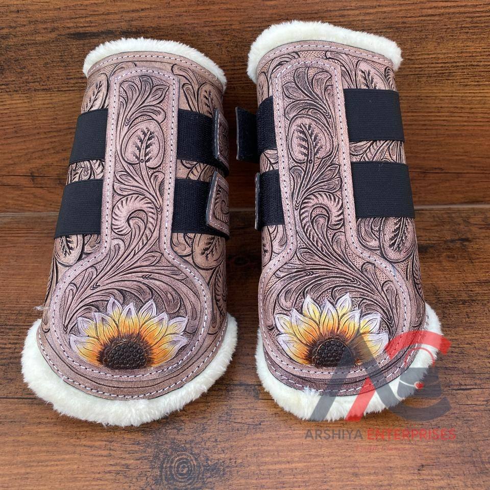 Western Handmade Tooled Cowhide Leather Sunflower Design Horse English Boots and Wraps Genuine Leather Soft Horse Accessories