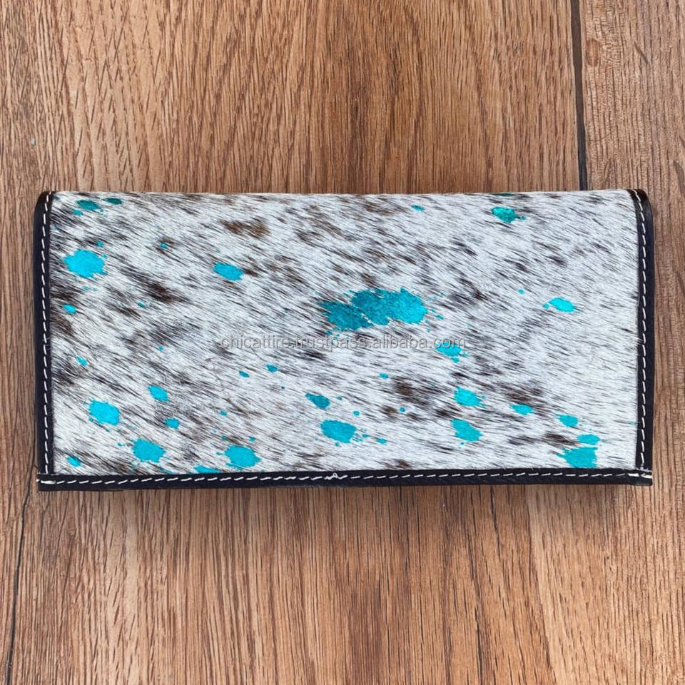Western Leather Clutch Hand Tooled Carving Phone Case Stylish Turquoise Colour Cowhide Fur Leather Wallet for Multi Uses
