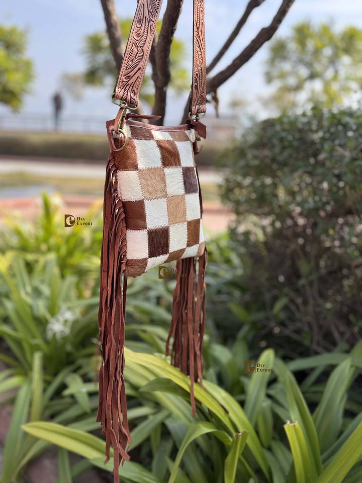 Western Pattern Cowhide Fur Leather Fringe Bag Hand Tooled Carving Beautiful Designer Party Wear Bags for Women's Multi Use