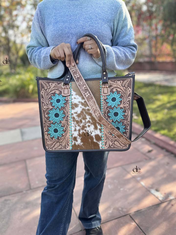Western Pattern Cowhide Fur Tote Bag Stylish Leather Purse Hair on Hide Carving Hand Tooled Bags for Women's Multi Use