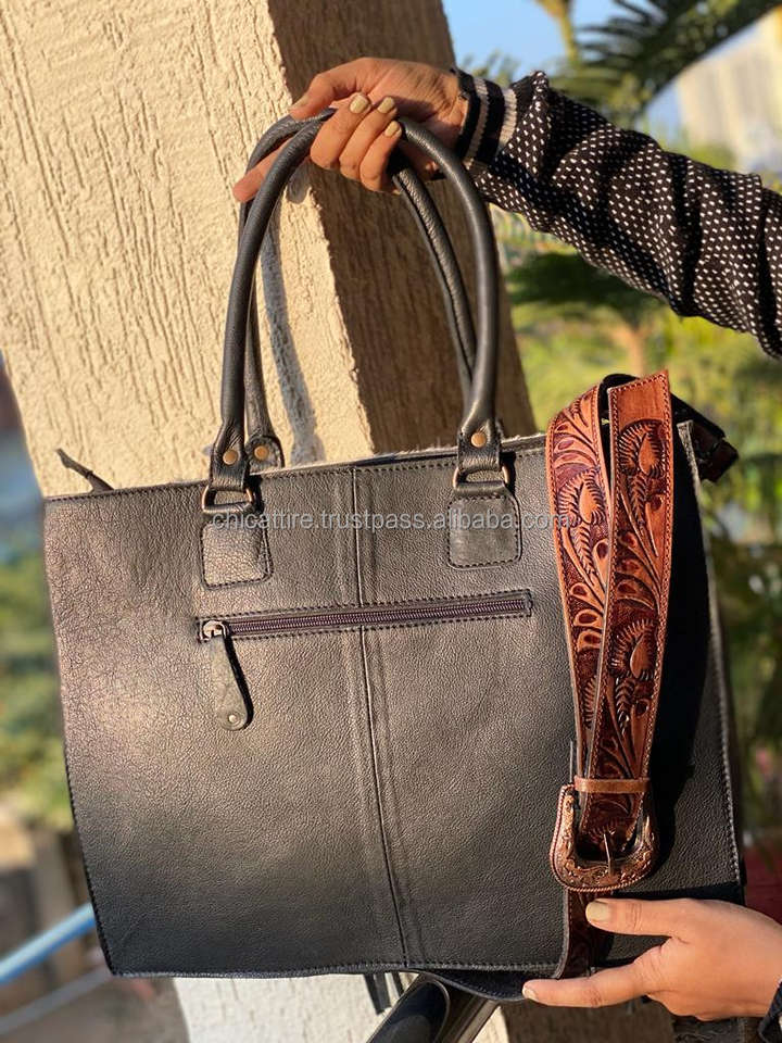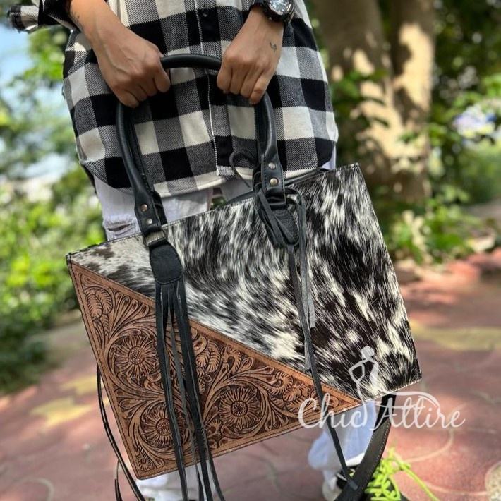 Western Pattern Cowhide Fur Tote Bag Stylish Leather Purse Hair on Hide Carving Hand Tooled Bags for Women's Multi Use