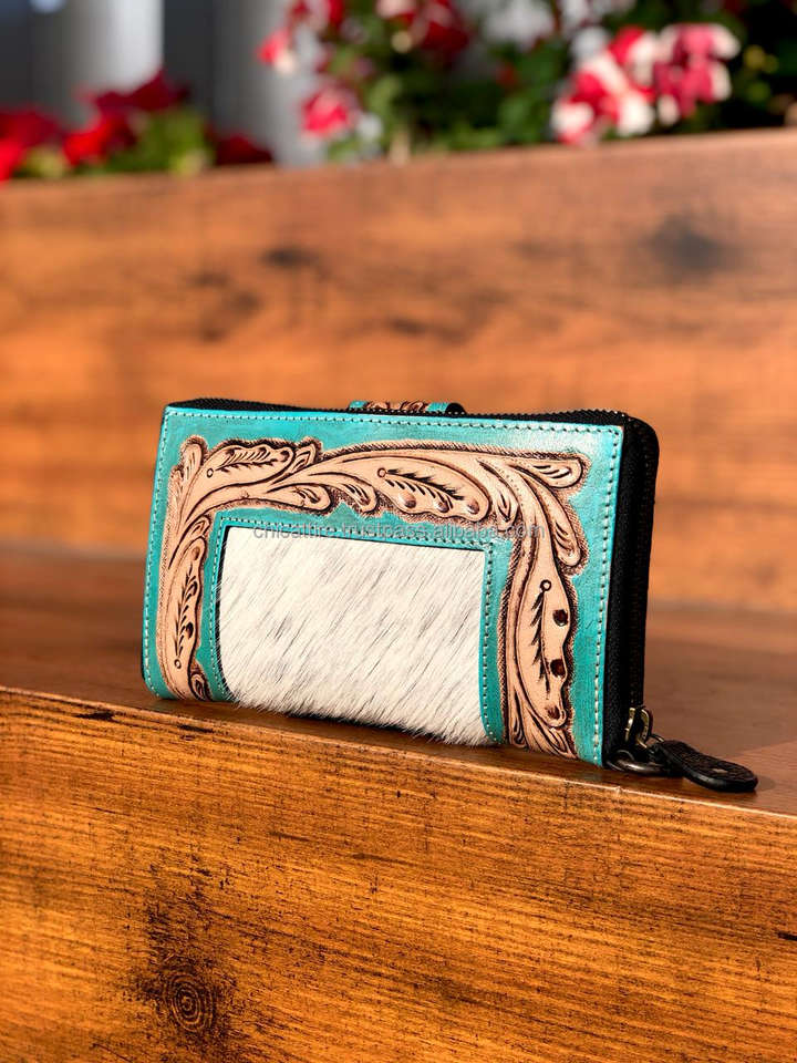 Western Pattern Hand Tooled Carving Wallet Clutch Border With Turquoise Colour Leather Cowhide Fur Wallet Multi Uses Wallets