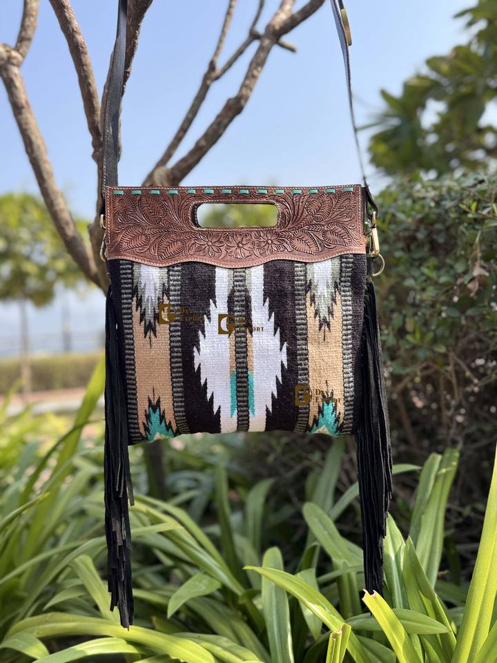 Western Pattern Hand Tooled Fringe Handbag Jacquard Leather Sling Bohemian Aztec Saddle Blanket Bags Stylish Bags for Women