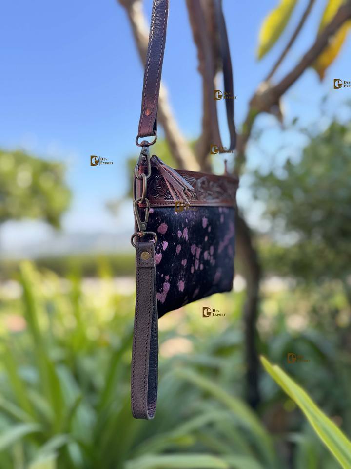 Western Patterned Leather Cowhide Metallic Fur Handbag Carving Hand Tooled Leather Handmade Tassel Boho Fur Sling Bag for Women