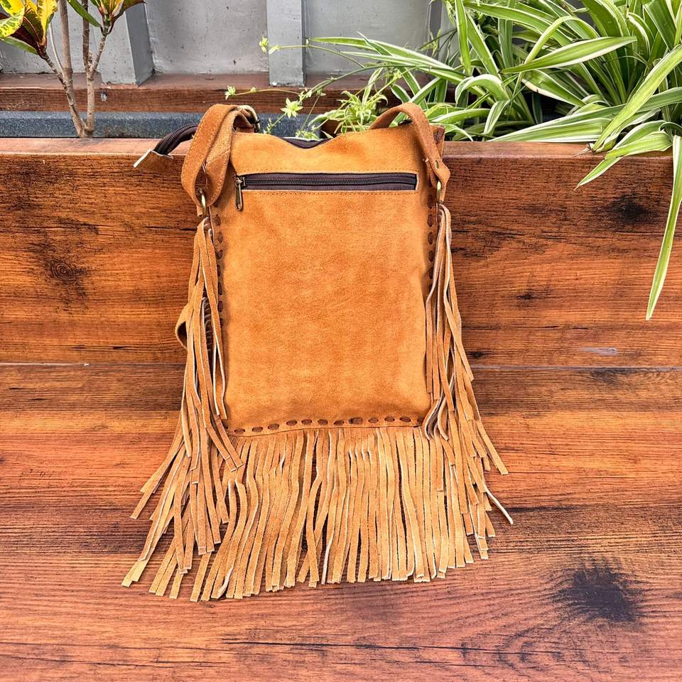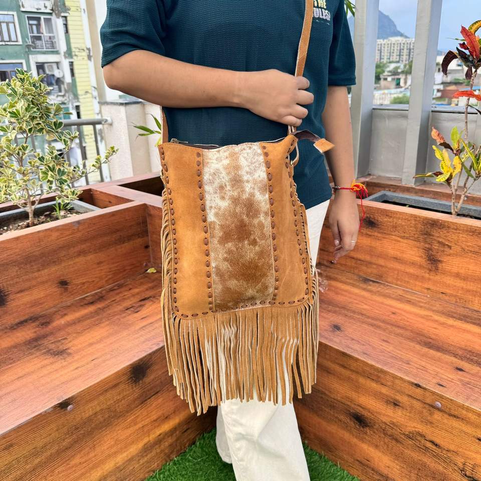 Western Style Cowhide Fur Leather Fringe Handbag Button Saddle Lock Embroidered Ladies Sling Purse Cross-Shape Shopping Bag