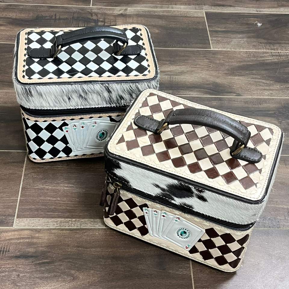 Western Style Hand Tooled Cowhide Leather Jewelry Organizer with Velvet Interior & Checkered Playing Card Pattern Jewelry Box