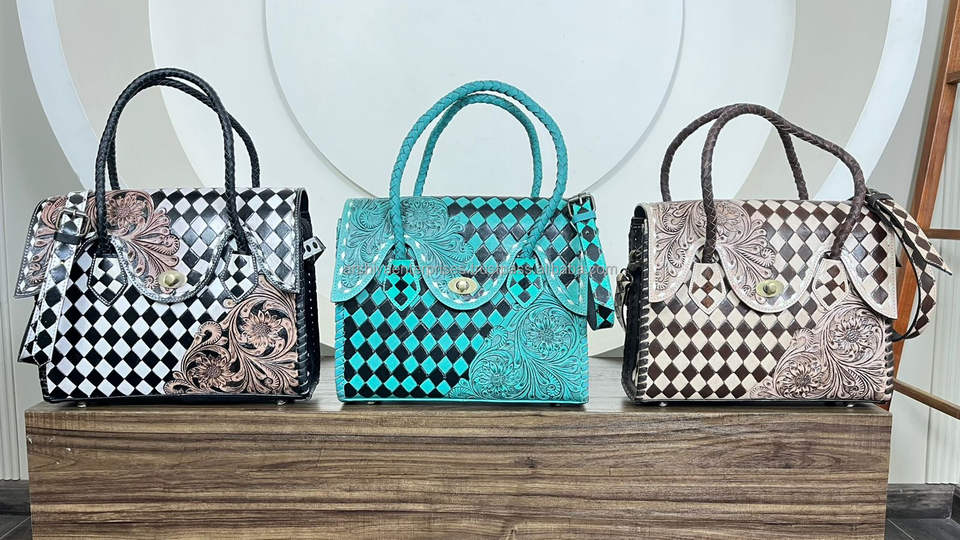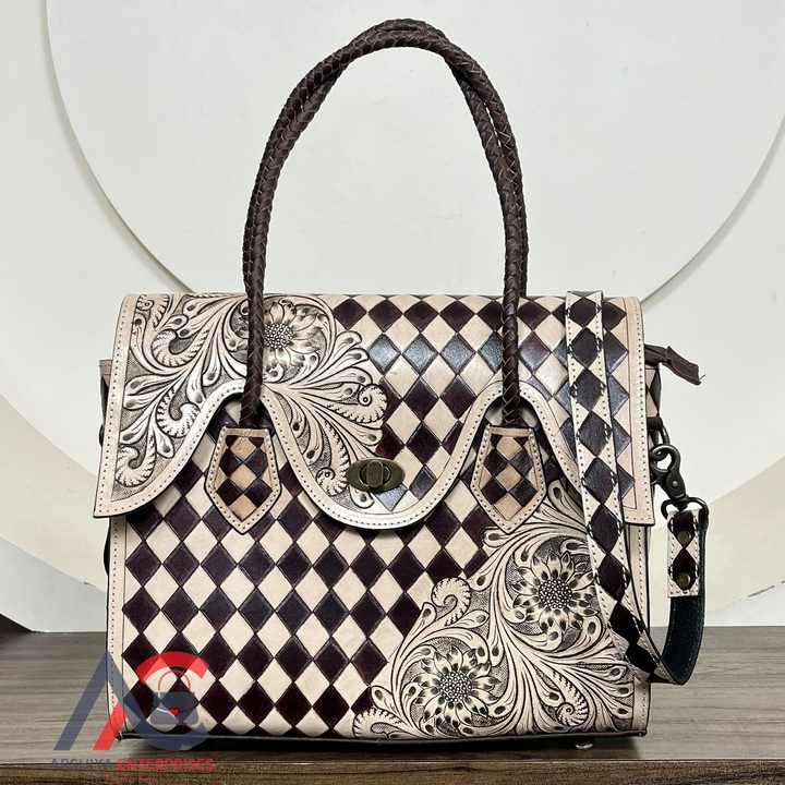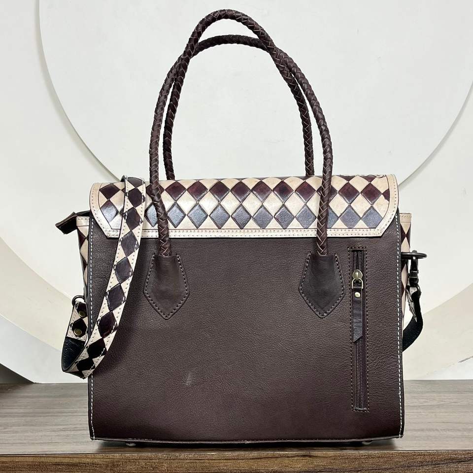 Western Style Handbag Women Hand Tooled Leather Crossbody Satchel Bag Checkerboard Design Shoulder Tote Bags with Braided Handle