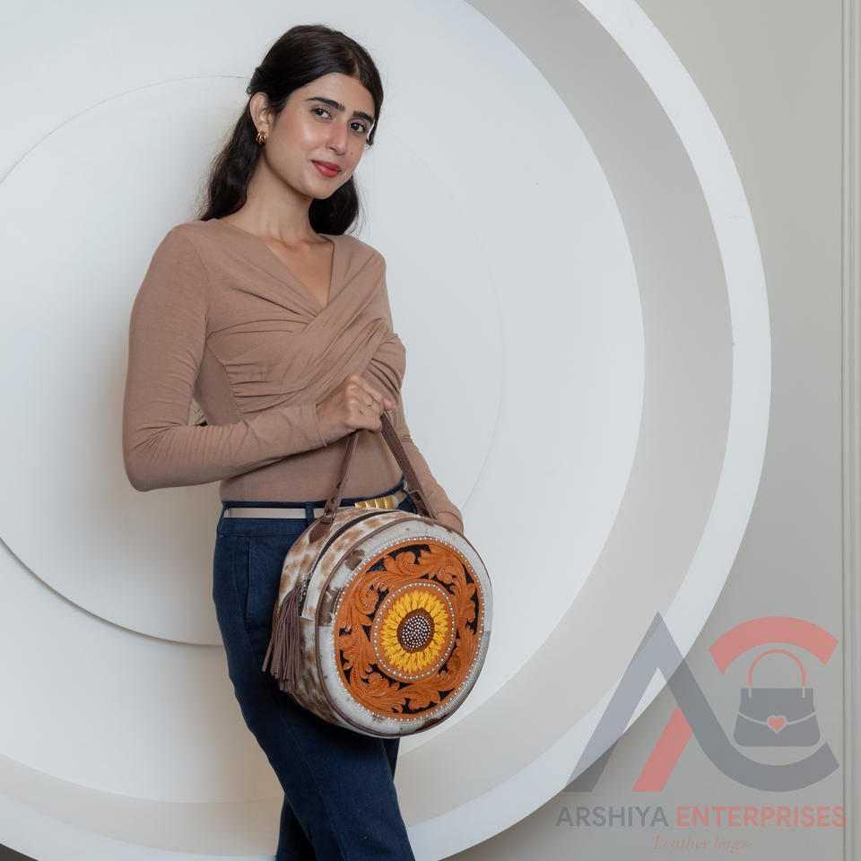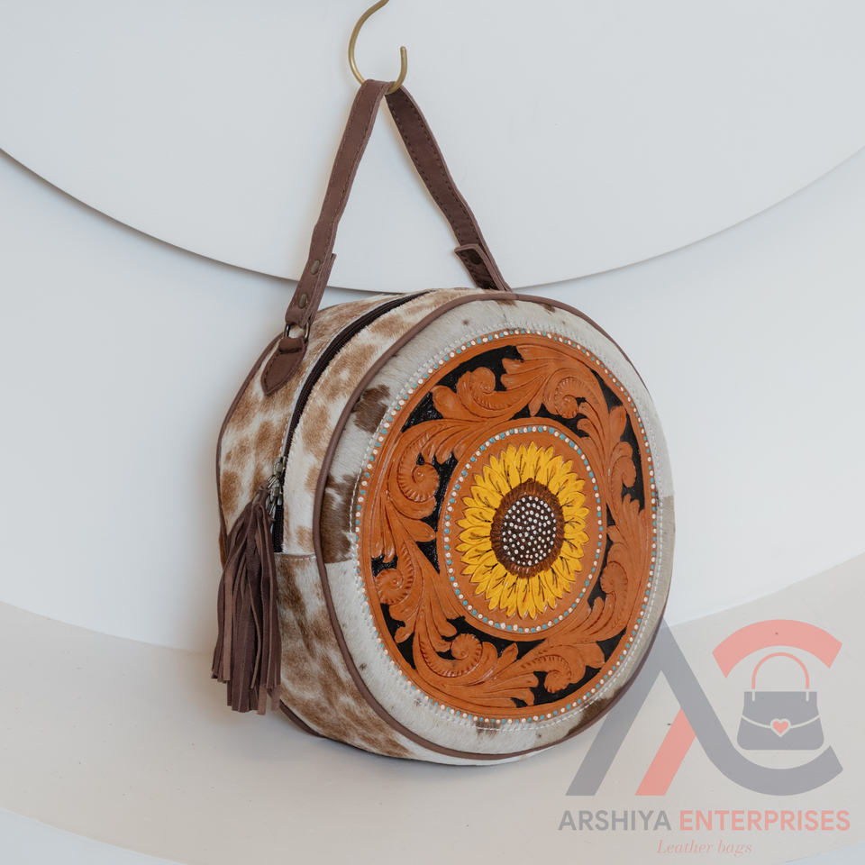 New Western Style Tooled Cowhide Fur Leather Canteen Bag Hand Tooled Round Shape Handbag Women Tooled Leather Shoulder Sling Bag