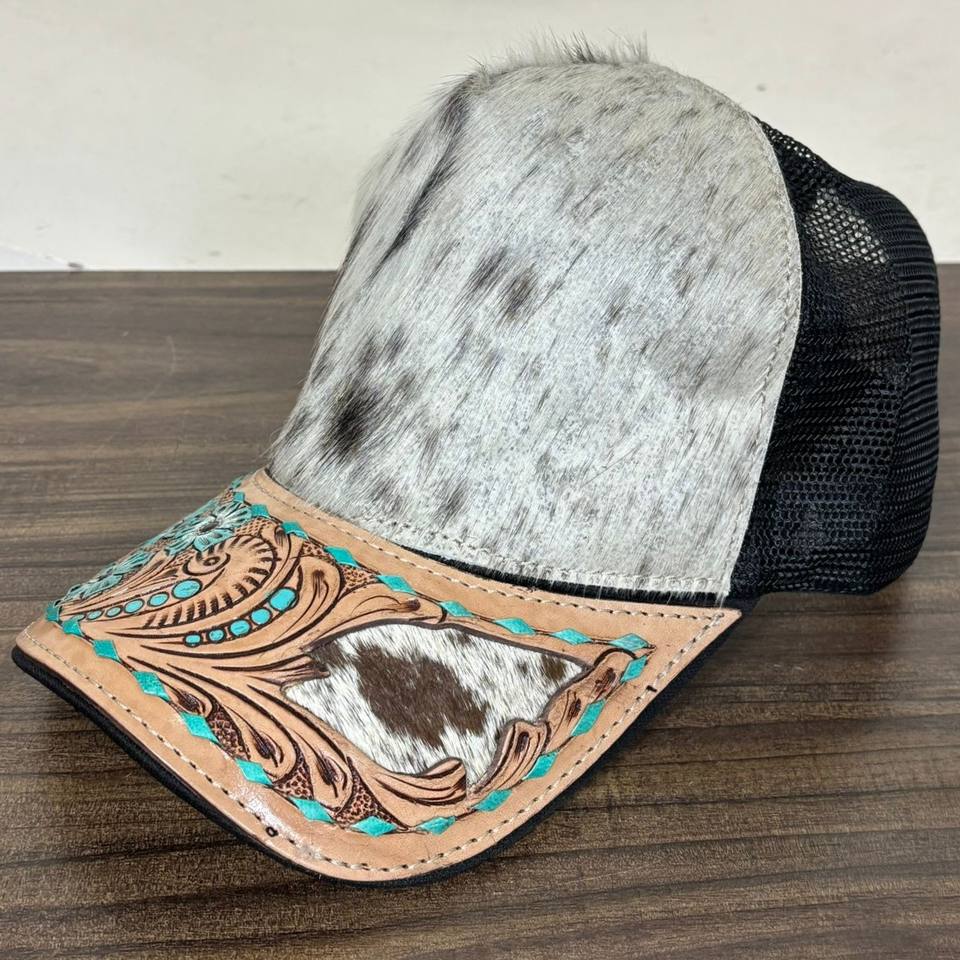 Custom Hand Tooled Cowhide Leather Trucker Mesh Hat
