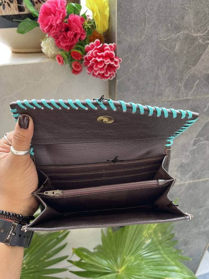 Western Stylish Hand Tooled Carving Wallet Clutch Stylish Turquoise Color Cowhide Fur Wallet Multi Uses New Design Clutch