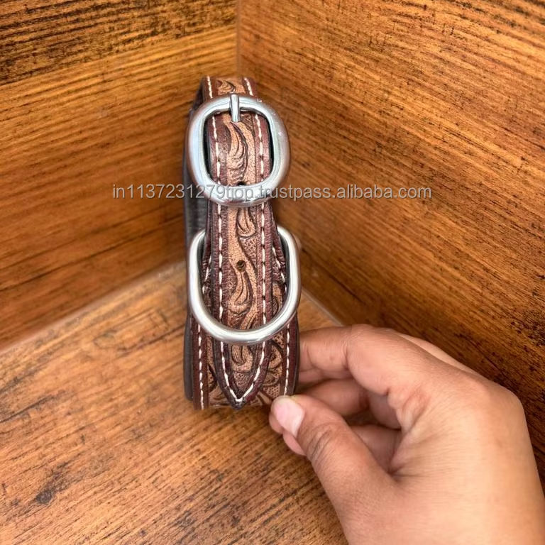 Western Tooled Leather Turquoise Tooling Print Dog Collar for Neck Genuine Leather Engraved Padded Adjustable Dog Collar for Pet