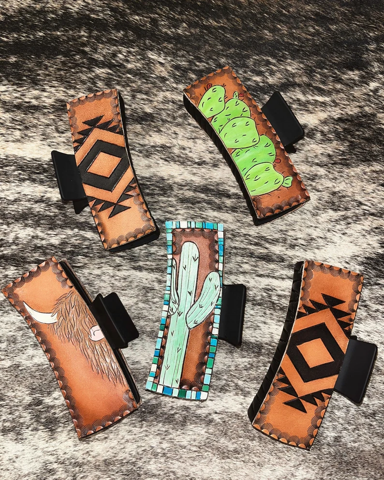 Western Vintage Cowgirl Style Leather Large Grab Clip for Cowgirl Mother Gift Cactus Design Acrylic Hair Claw Accessories