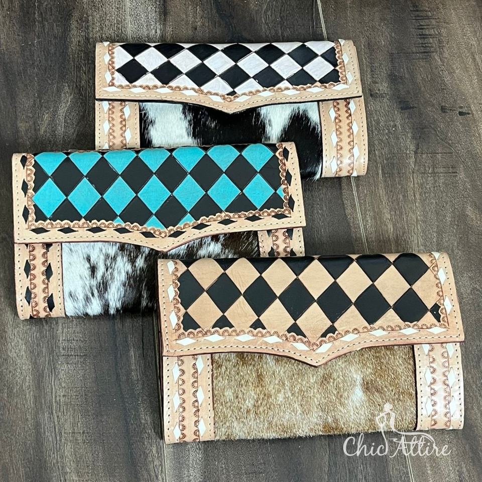 Western Women Fashion Luxury Durable Long High Capacity Hand Tooled Checkered Leather Wallets Custom Cowhide Mobile Phone Clutch
