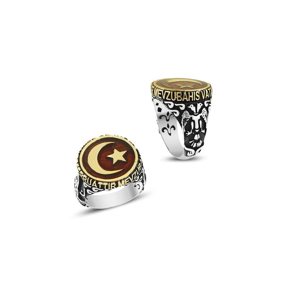 "When it comes to the homeland, everything else is secondary" inscribed crescent moon and star ring.