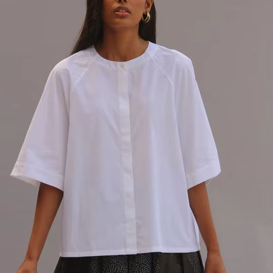 White 100% Cotton Regular Mandarin Collar Blouse Casual Loose Fit Horn Sleeve Top Button Breathable Christmas Occasions