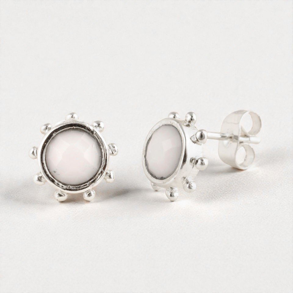 White Agate Gemstone Stud Earrings 925 Sterling Silver Beaded Bezel Round Minimalist Moissanite Wholesale Jewelry