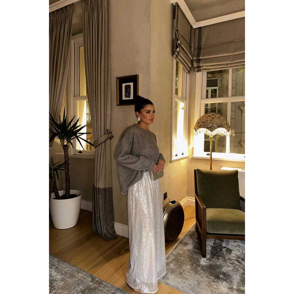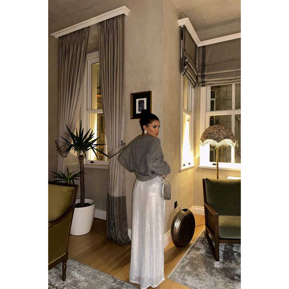 White Alexa Denim and Silk Pencil Skirt with Sequin Detail Midi Length Pleat Detail Workwear Skirt
