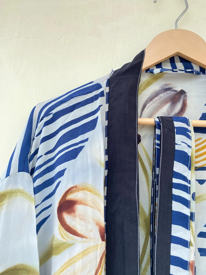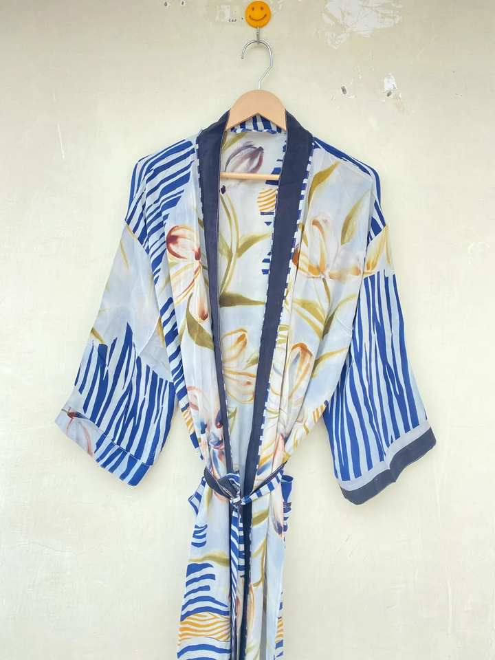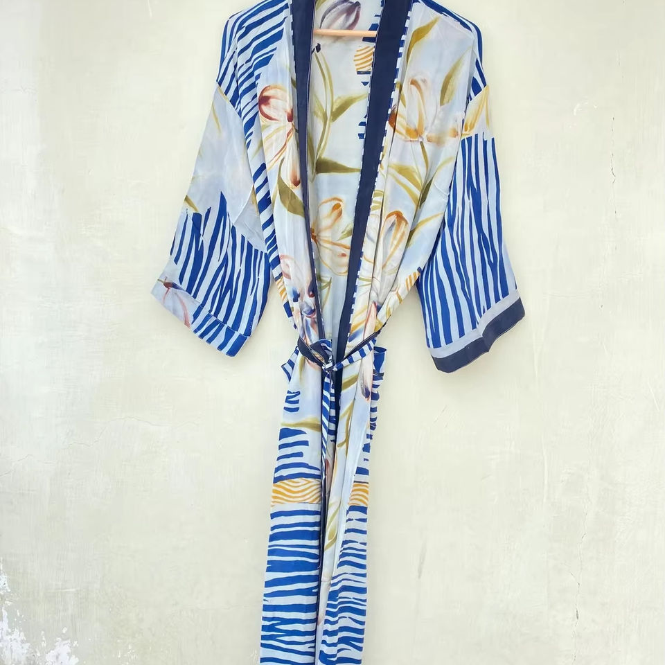 Vintage White and Blue Silk Kimono Robe Dress Recycled Summer Autumn Spring Daily Life Style Robe