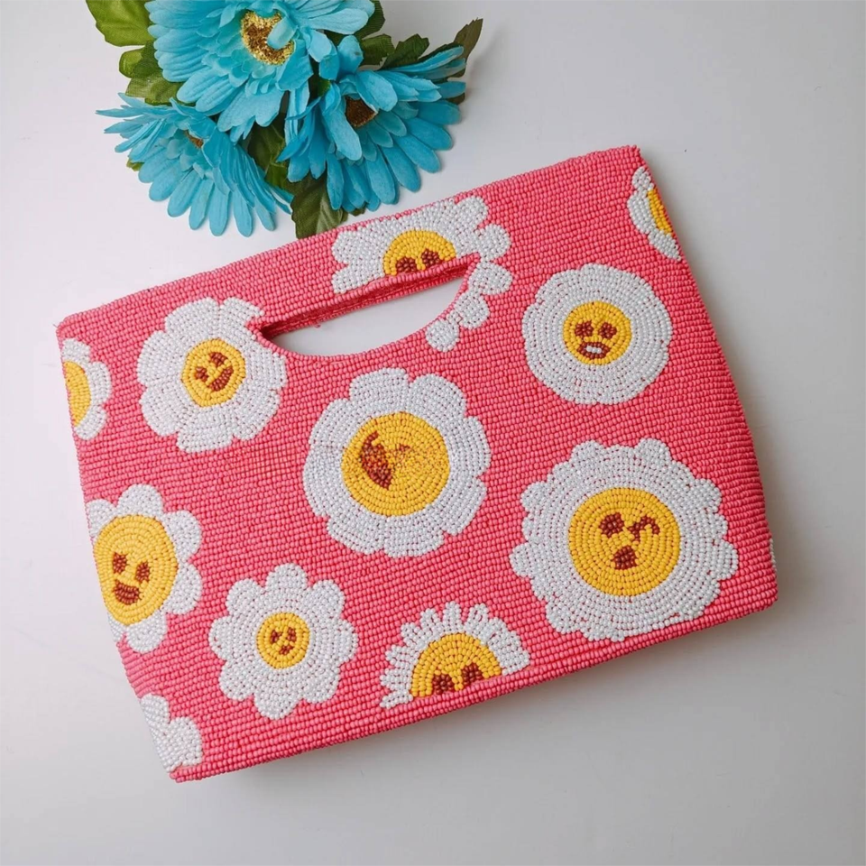 White Bead Pink and Yellow Beaded Flower Design Women's Clutch