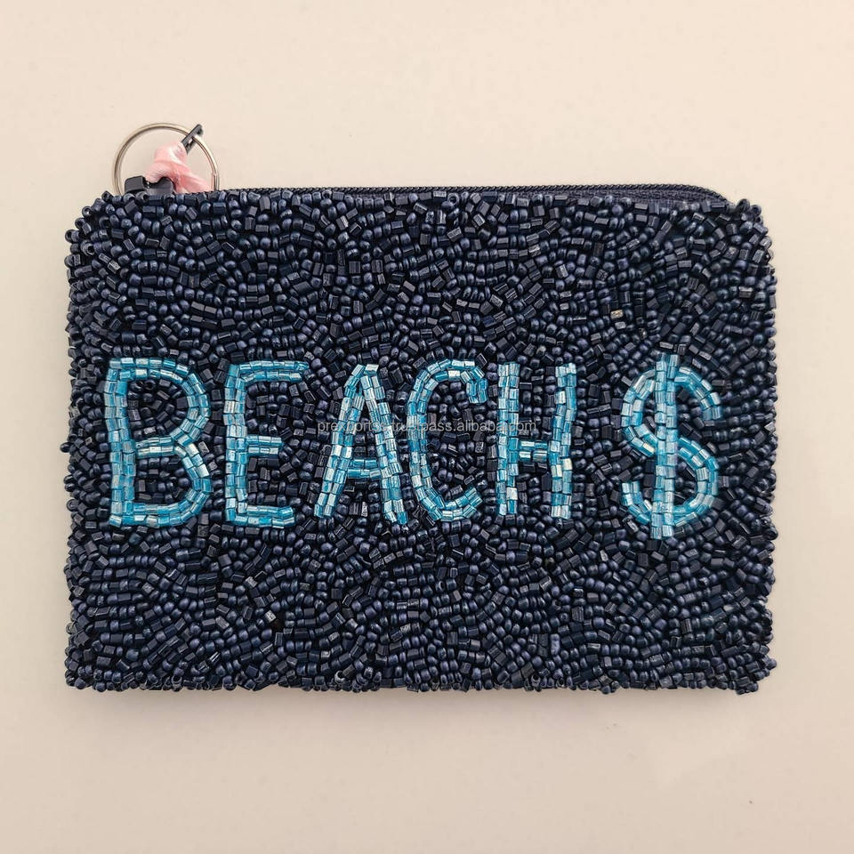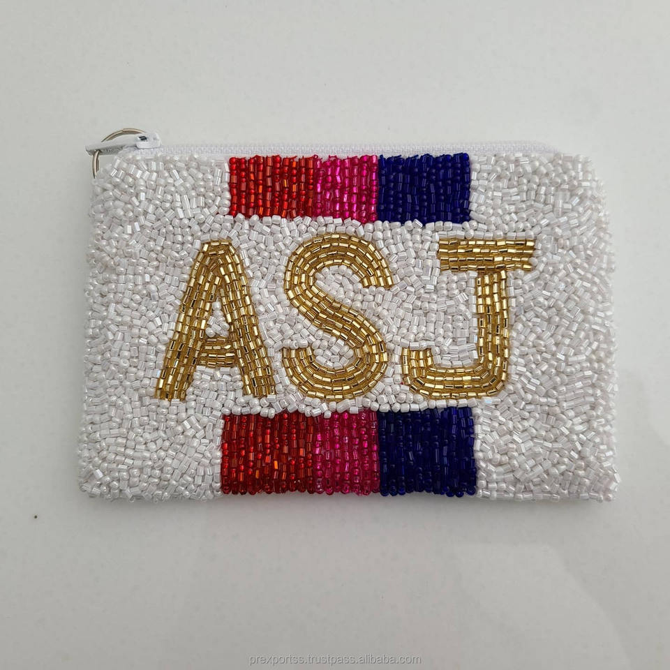 White Beaded Initial ASJ Coin Purse Custom Letters Pouch Gold Alphabet Design Zipper Wallet Monogram Embroidery Gift Stripe