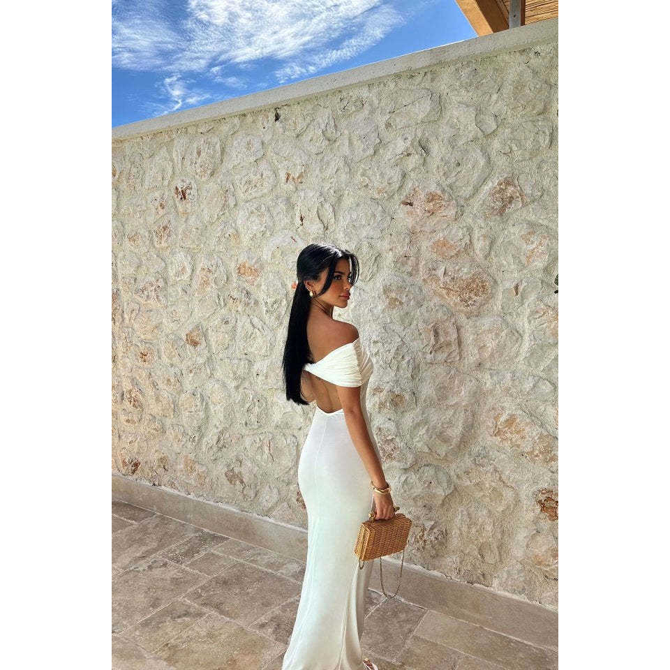 White Brunella Ball Gown Dress Sequined Back Detail Short Sleeve Floor-Length Elegant Party Style 3D Flower Simple Design