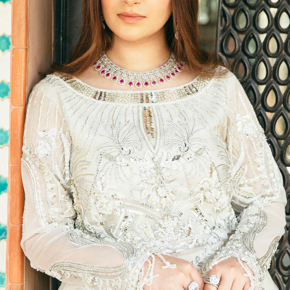 White Color Ready to Wear Stitched Net Fabric Pakistani Frocks Style Over Full Front Embroidery with Jamawar Trouser