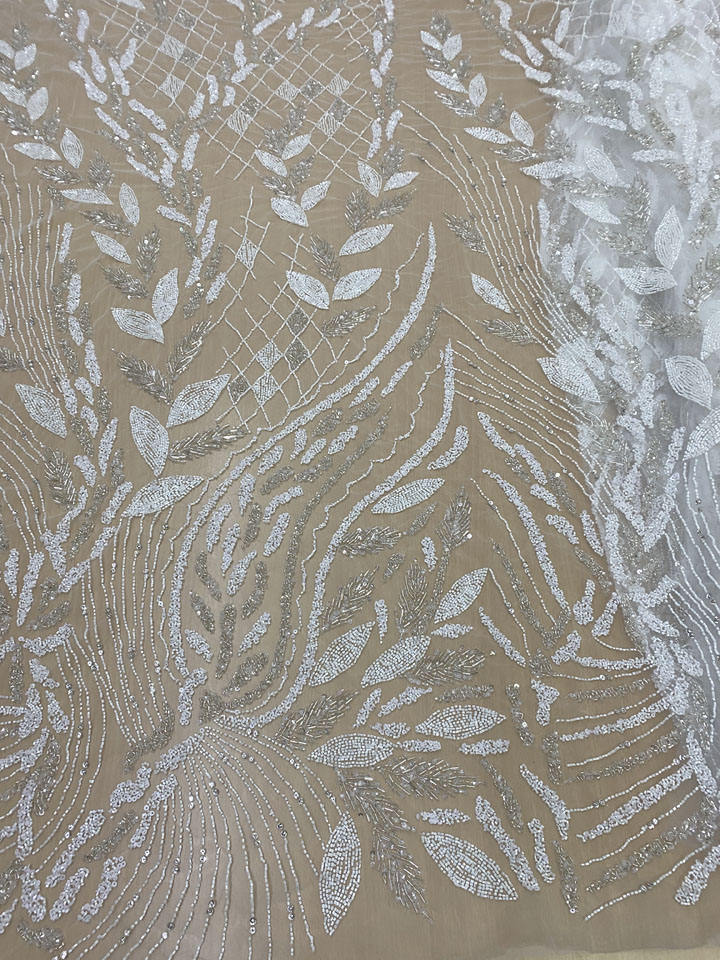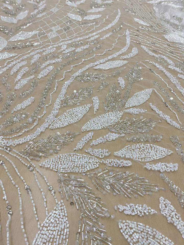 Beige Color Luxury Glass Sequin Embroidery Beaded Lace Fabric with Hand Embroidery Eco-Friendly Bridal Wear India Manufacturer