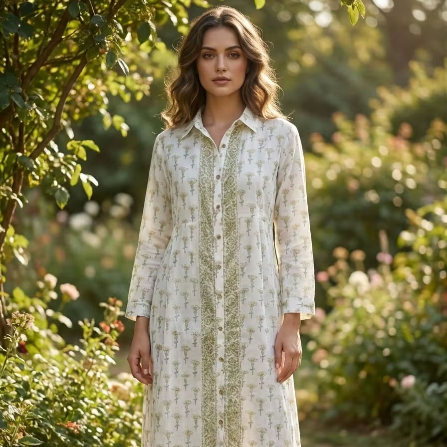 White Cotton Button Down Maxi Shirt Dress with Green Floral Print Long Sleeve Summer Garden Party Dress Boho Chic Collar Gown