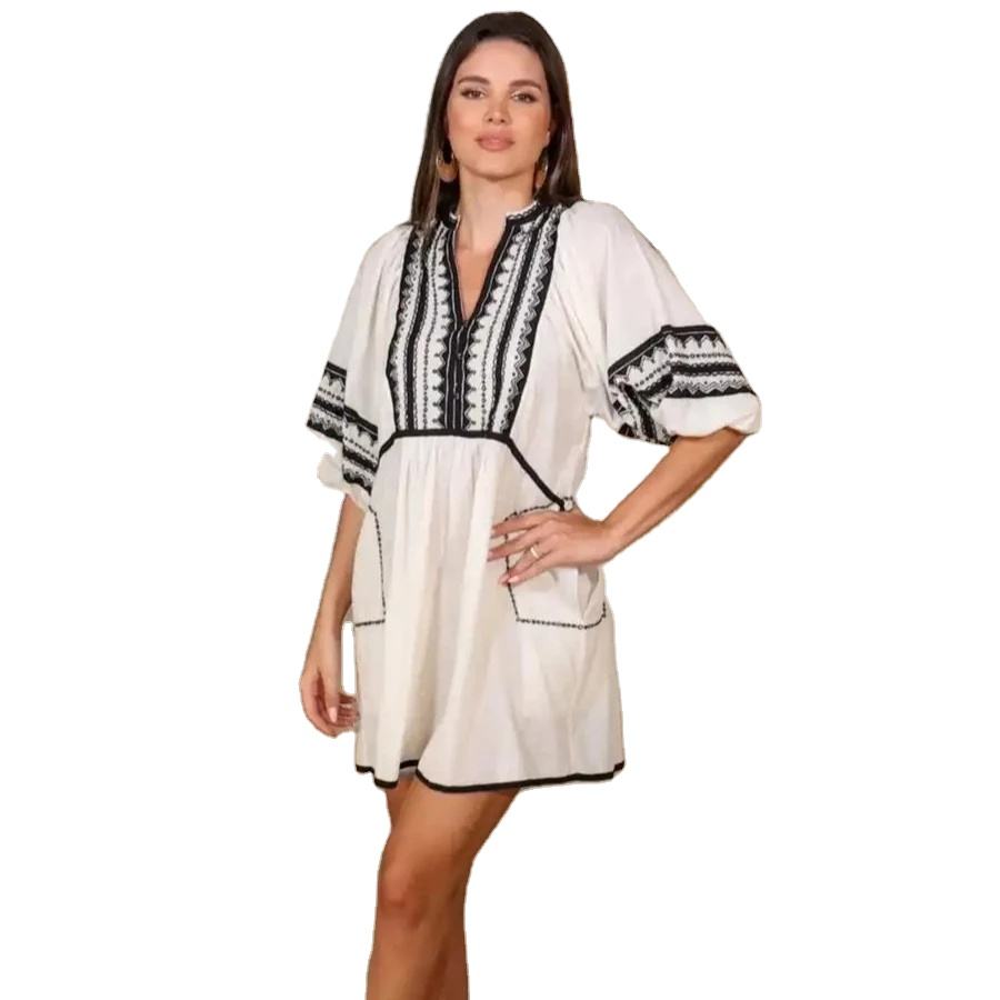 White Cotton Short Dresses for Women Printed Three Quarter Sleeve Boho Gypsy Dress