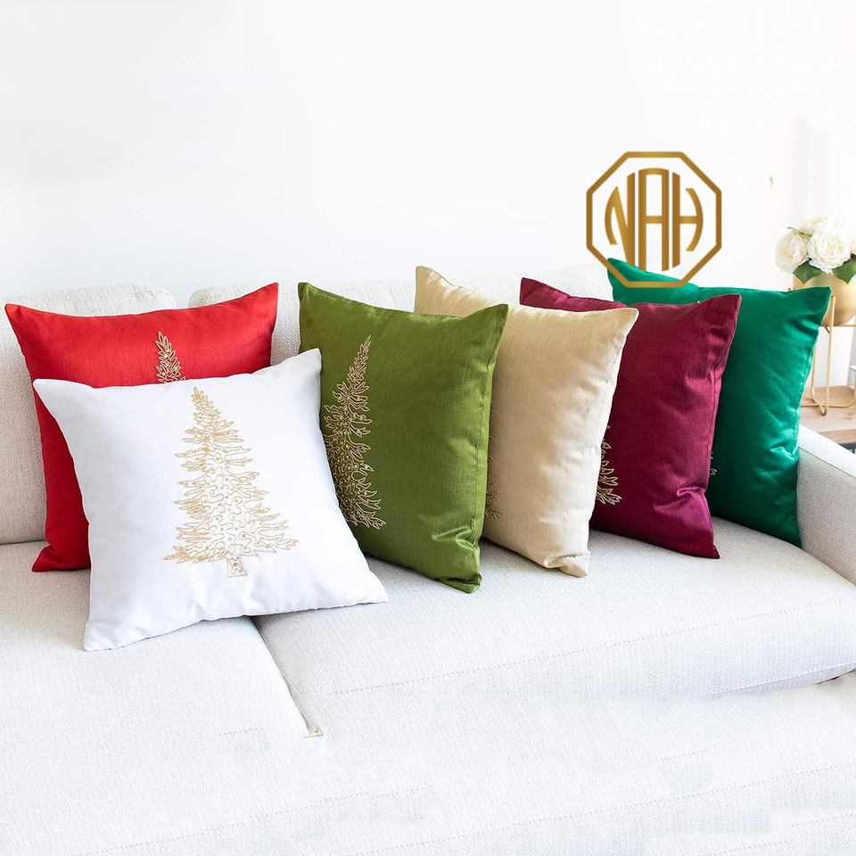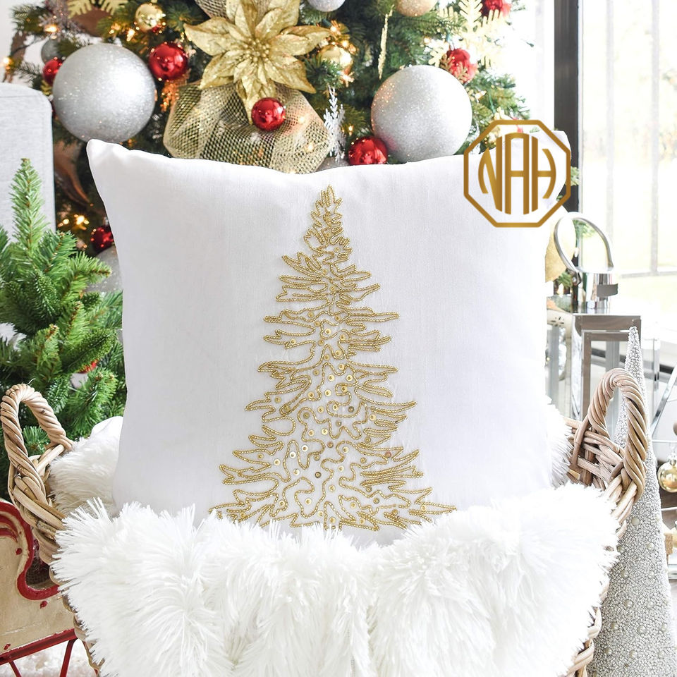 White Decorative Pillow Cover Gold Christmas Tree Embroidery Festive Sofa Cushion Wholesale Manufacturer Custom Holiday Export