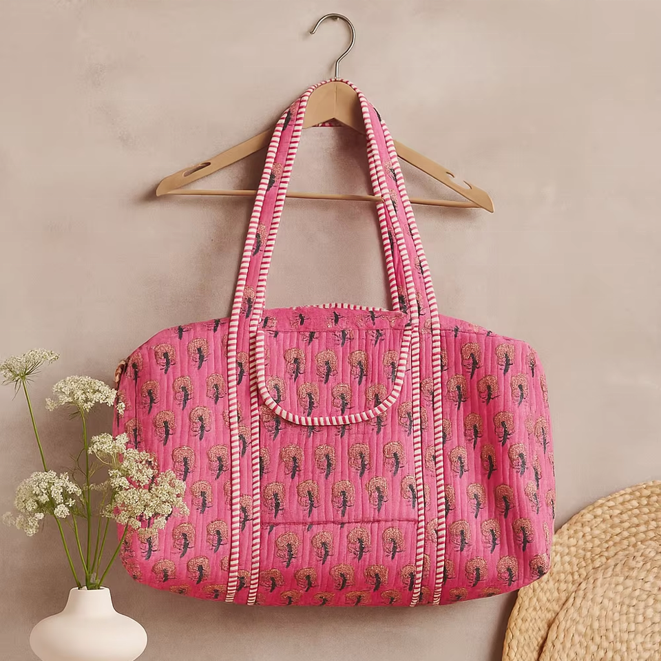 White Floral Quilted Duffle Bag Handcrafted Travel Tote with Vintage Charm Vibrant Patchwork Casual Zipper Storage