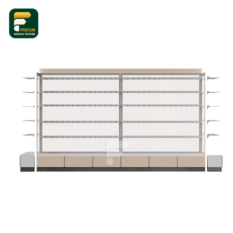 White Frame Adjustable Glass Shelves Beige Storage Drawers Multi-Level Retail Display Stand