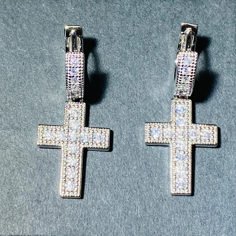 White Gold Cross Diamond Earrings Natural Round Brilliant Cut G Color Religious Ceremonies Unisex Silver Jewelry