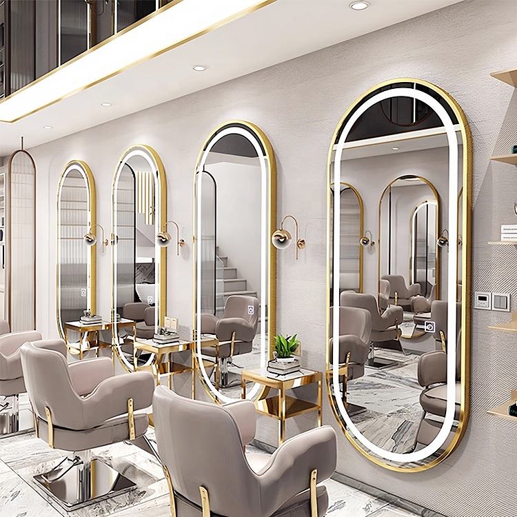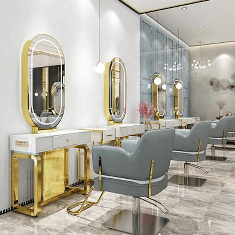 White Gold Oval-Shaped Luxury Lighted Mirror Station Hair Salon Furniture Table Mirror with Drawer