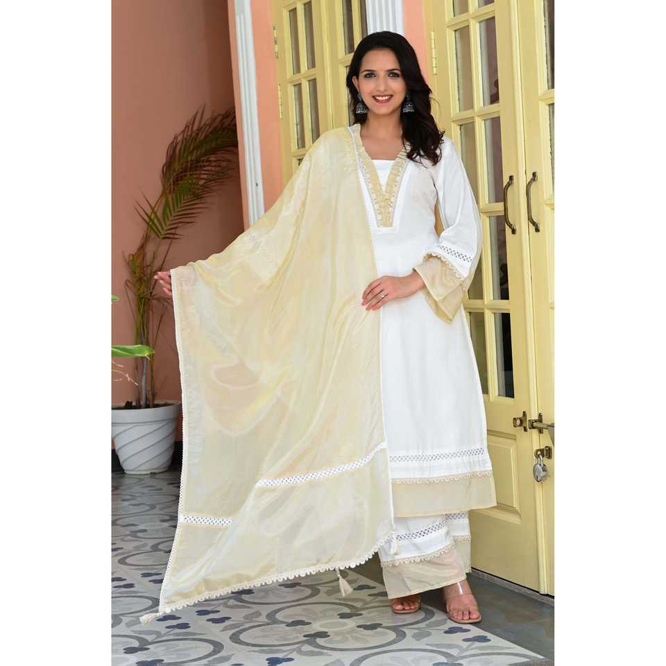 White & Gold Women's Sets Fancy Lace Work Yoke Muslin Kurta with Trousers & Tissue Organza Dupatta