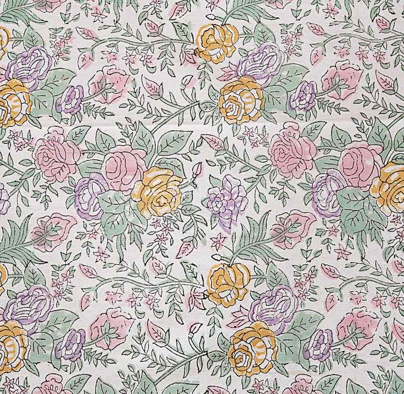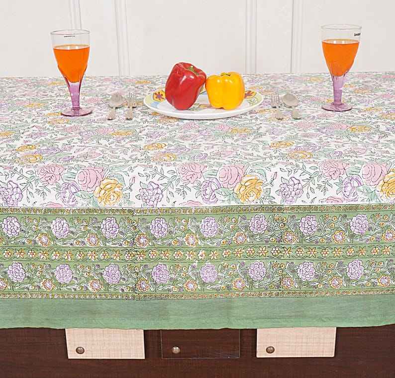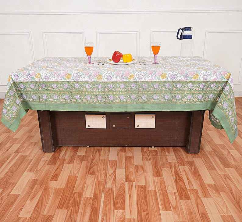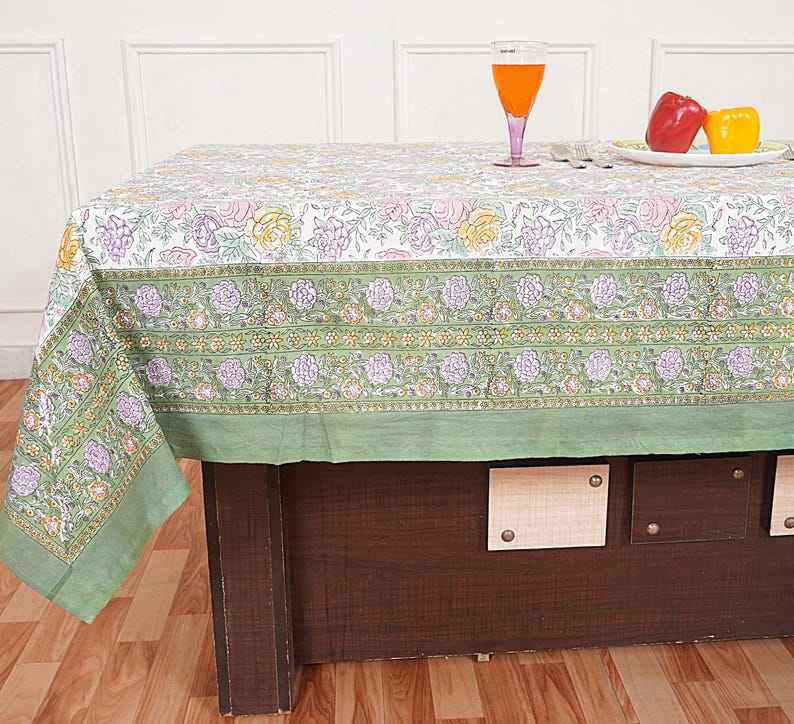 White Green Floral Hand Block Printed Tablecloth for Dining Rustic Wedding Party Kitchen Linen Boho Decor