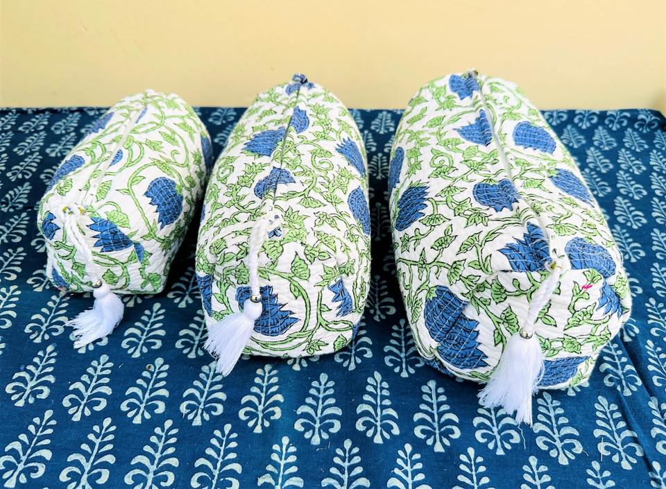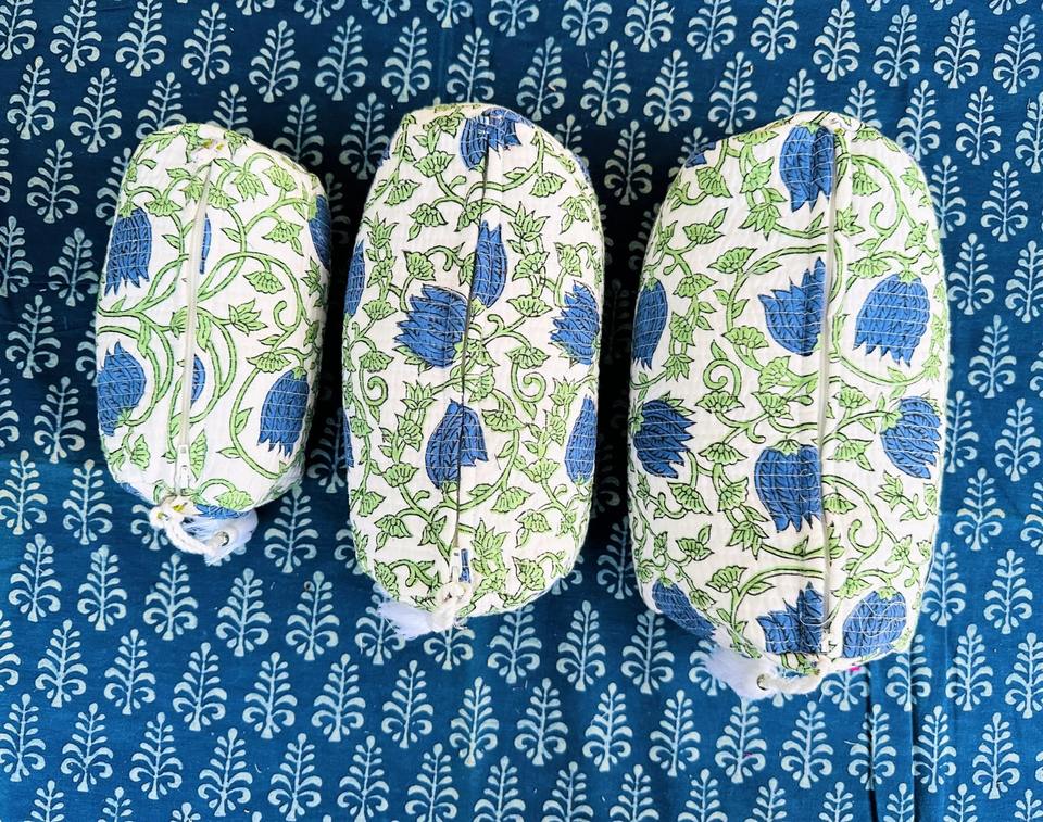 White Green Floral Printed Water Resistant Eco-Friendly Cotton Case Zipper Closure Large Vintage Style Hand Carry Makeup Storage