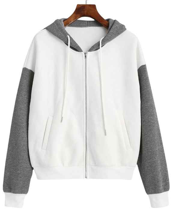 White Grey Contrast Zip Up Hoodie With Front Pockets Casual Streetwear Unisex Soft Comfortable Warm Fashion Zipper Jacket
