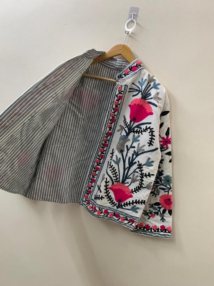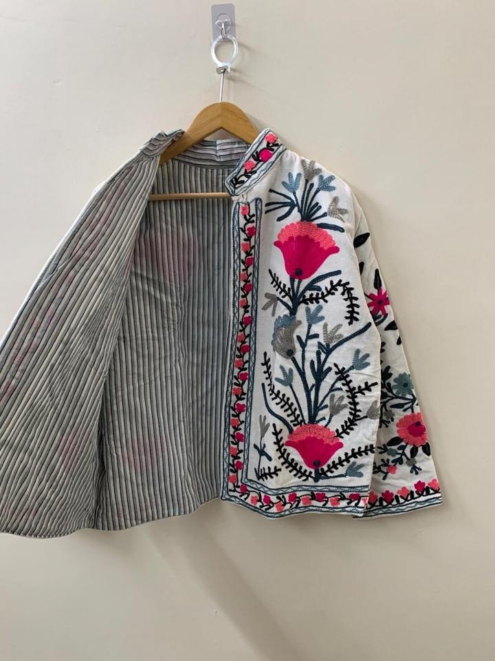 White Handmade Velvet Vintage Suzani With Pocket Winter Short Jacket Bomber Floral Jacket For Womens